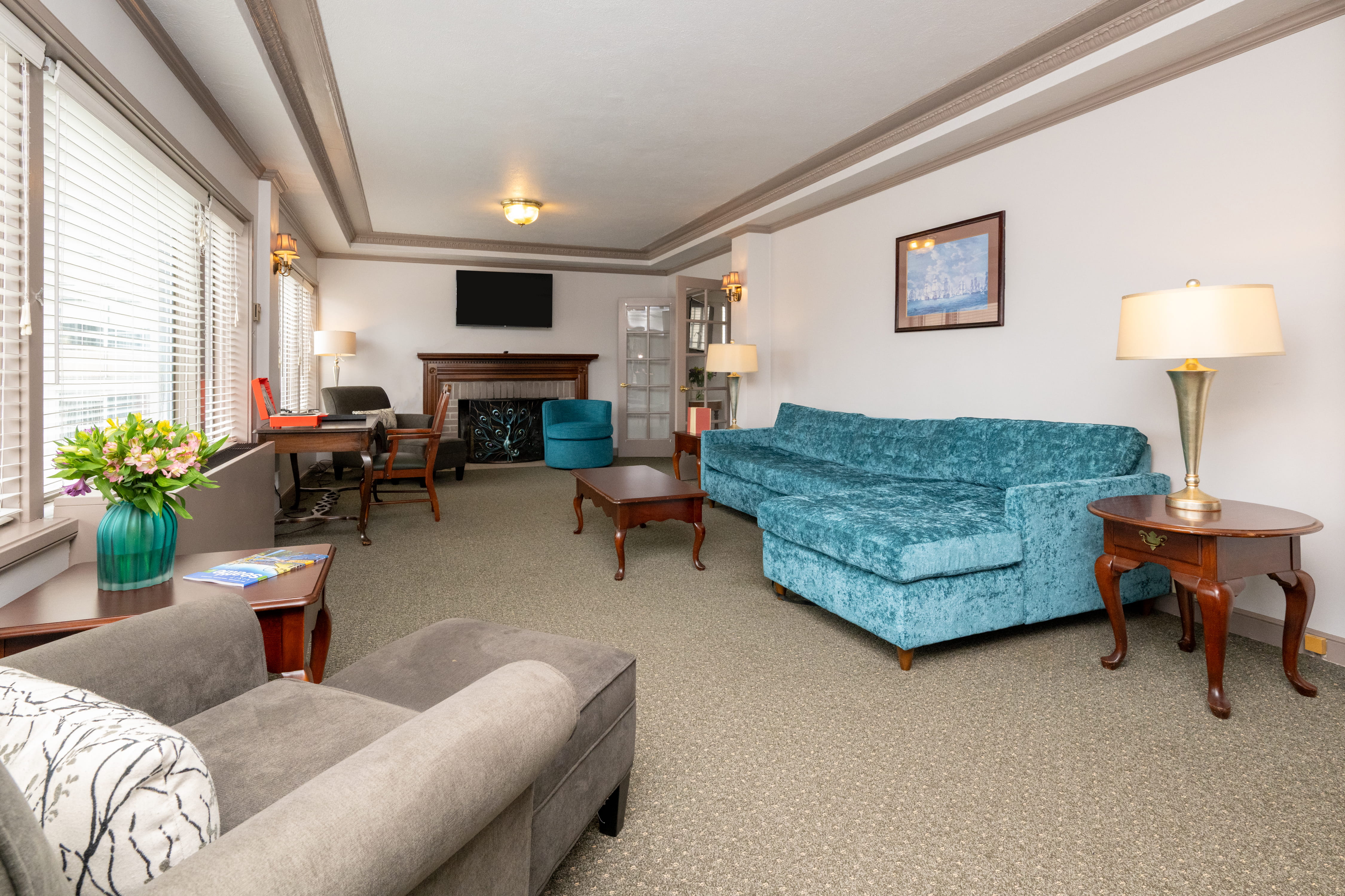 Order Room ServiceSet the stage for your next gathering in our Penthouse Suite, designed for elevated comfort and memorable moments. Available for half-day or full-day rental, the 785-square-foot Penthouse Suite offers a gracious, residential-style setting ideal for intimate meetings, social gatherings, or private celebrations. The spacious layout features a decorative fireplace, multiple seating areas, and a small wet bar with refrigerator, microwave, sink, and coffeemaker, making it the perfect spot for entertaining or relaxing. Two 60" TVs, a separate sleeping parlor with king bed, and a private bath with jetted tub add to the suite’s versatility, while easy access to the rooftop deck provides an extra touch of openness and fresh air.